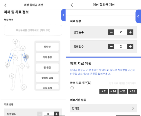 부상 부위도 매우 자세하고 다양하게 나와 있기 때문에 타박상, 통증, 골절 등 선택이 가능하고, 입원일 수, 통원일 수, 의료기관 종류 등 다양한 정보를 입력하여 예상 합의금을 정확하게 계산할 수 있습니다.
