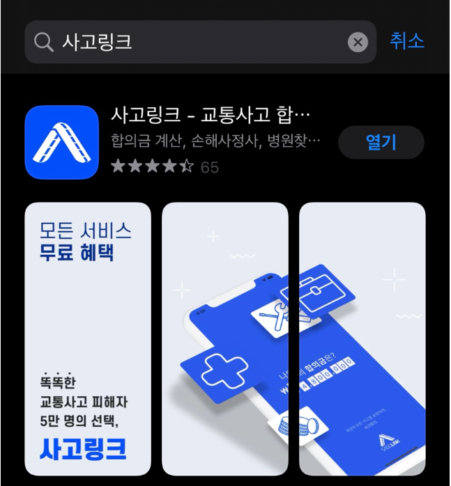 보험사에서는 명확한 계산법 만으로 지급하지 않기 때문에 여러분이 대략적으로라도 어느 정도 합의금이 나오겠다고 도움을 받을 수 있는 것이 '사고링크'라는 어플입니다.