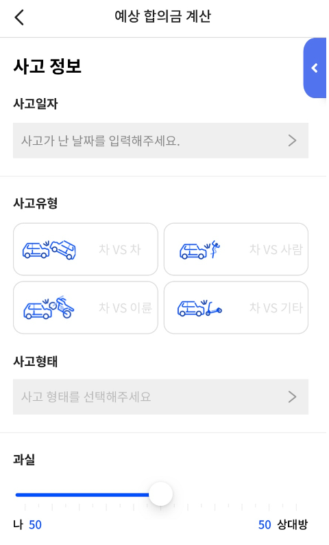 먼저 계산 메뉴에서 사고일자, 사고유형, 과실 등을 선택합니다.