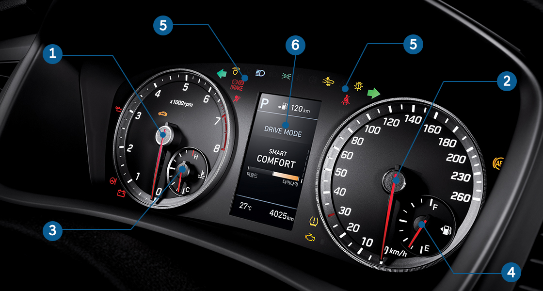 먼저 계기판의 기본적인 구성부터 살펴 보도록 하겠습니다. 번호 순서대로 설명드리겠습니다.