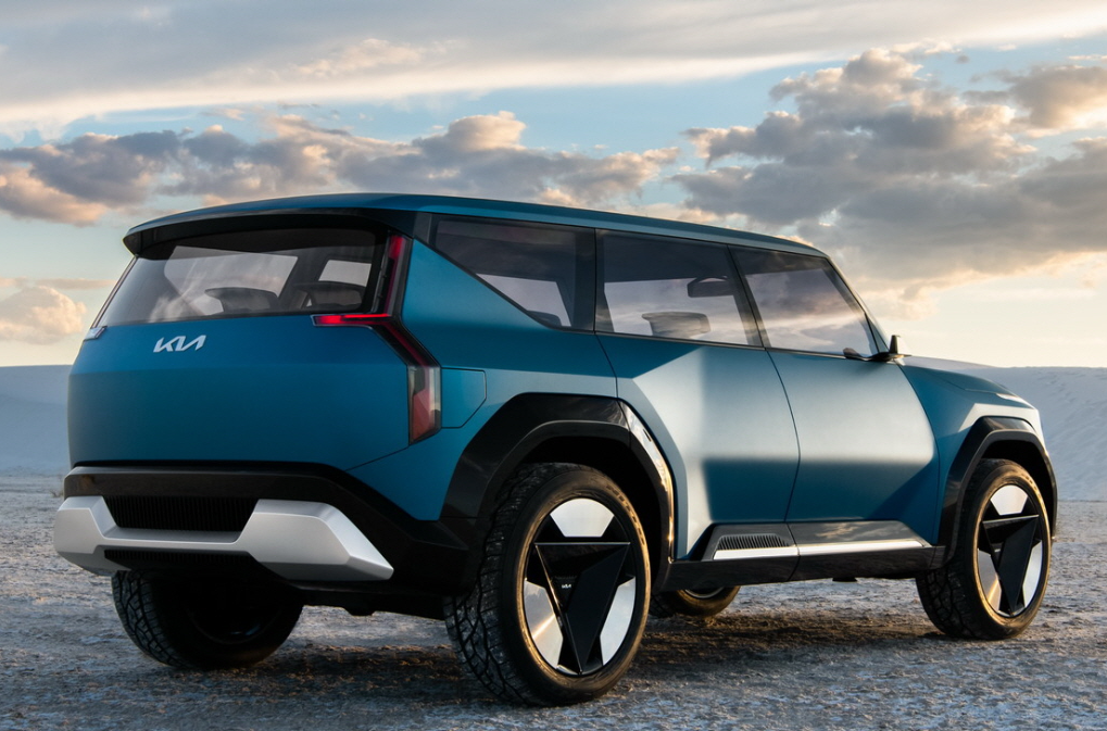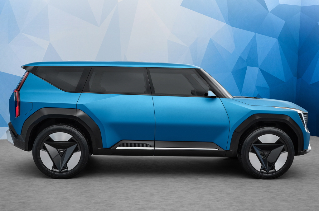 EV9은 기아의 모하비와 유사한 박스형 스타일로 측면부는 오토 플러시 도어핸들과 플래그 타입 사이드미러, 볼륨감이 강조된 펜더 등이 적용됩니다.